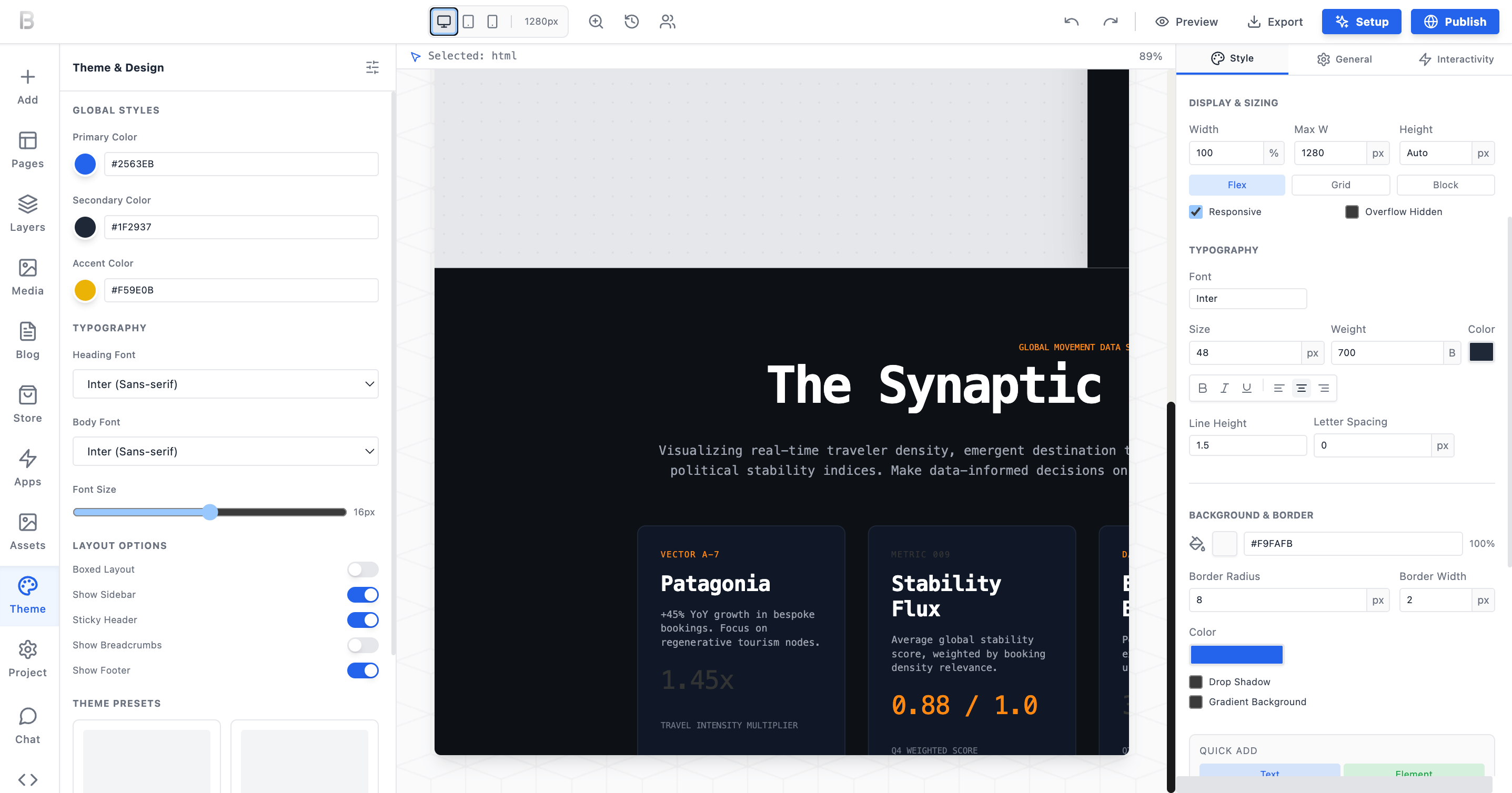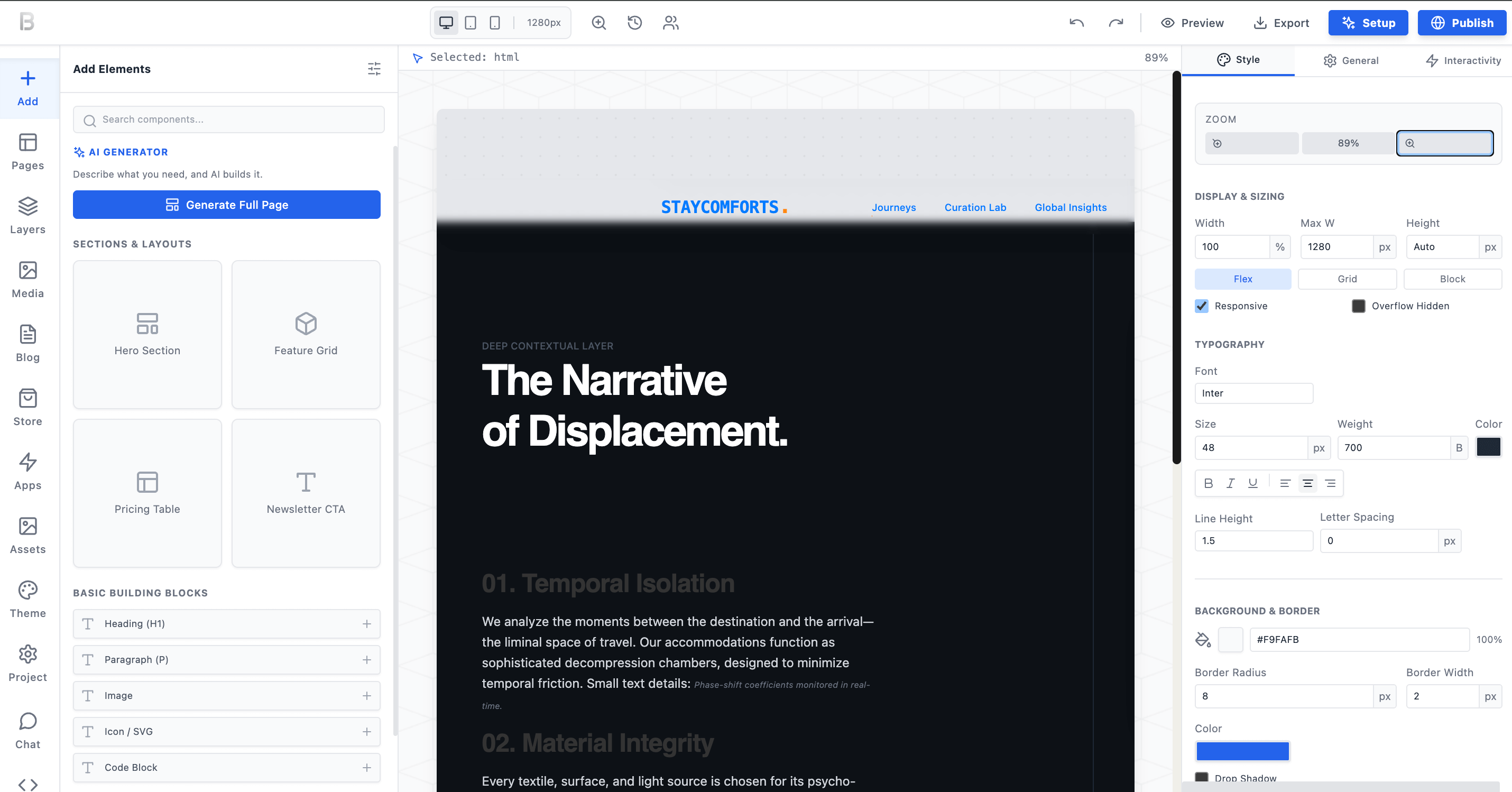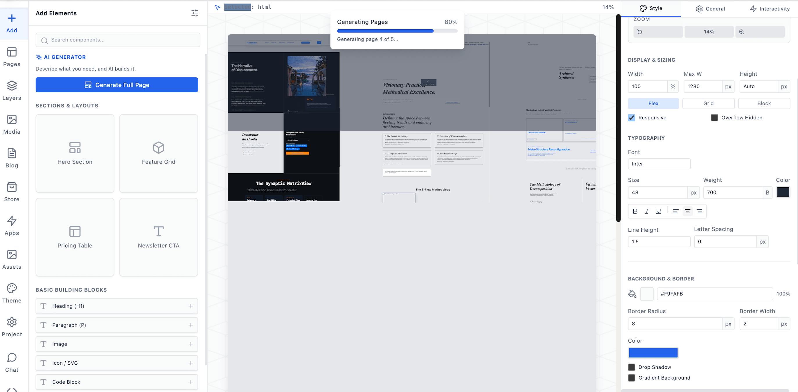 Professional workspace for creating and managing AI-powered websites with intuitive design tools.